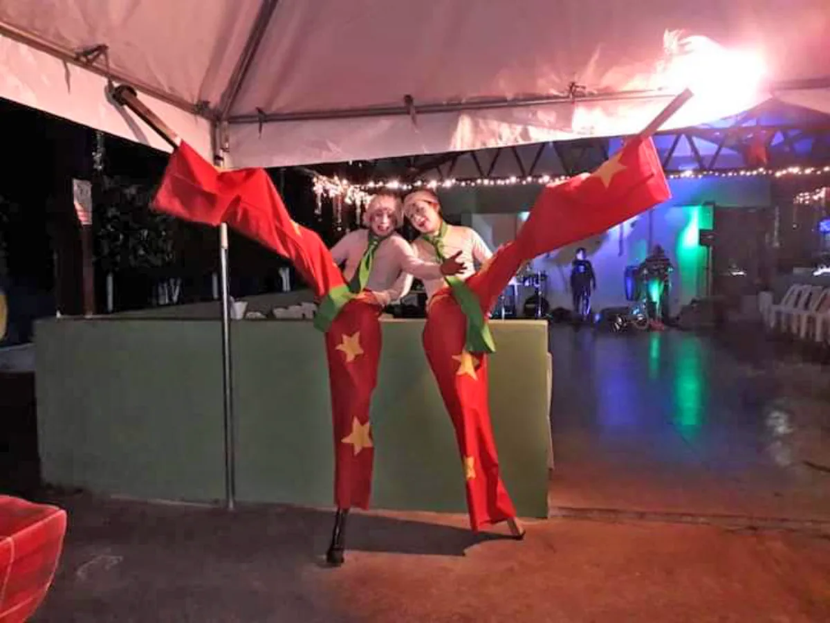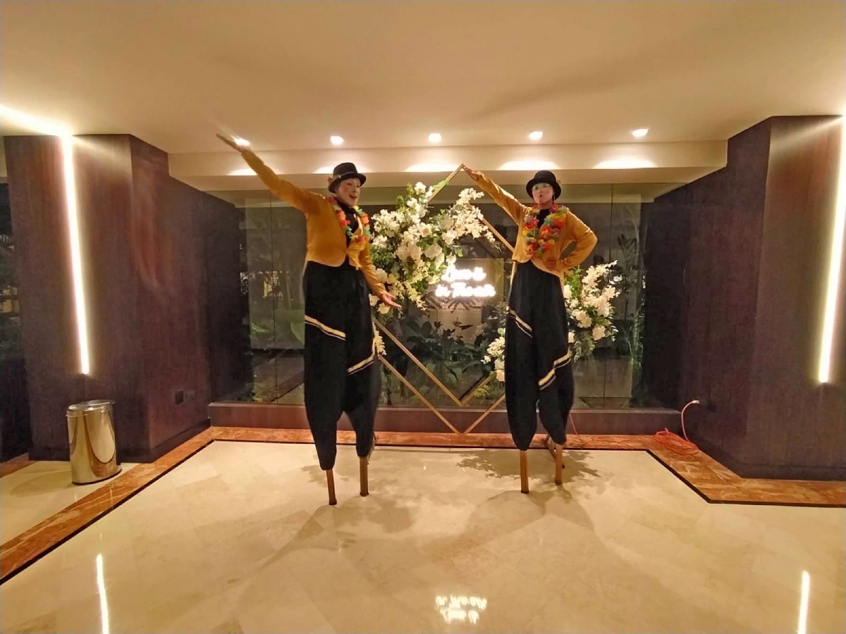 Iniciamos con una cálida bienvenida para sumergir a todos en la atmósfera festiva : Nuestros artistas no solo actúan, sino que interactúan directamente con el público, creando un ambiente participativo y lleno de energía. Disfruta de una exhibición acrobática impresionante. Desde correr y saltar hasta habilidades sorprendentes como caminar en un pie, cada movimiento es una muestra de destreza y coordinación: Déjate maravillar por las habilidades de nuestros artistas con malabares, añadiendo un toque de magia y destreza al espectáculo. Inmortaliza el momento con una sección especial de fotografías. Captura recuerdos únicos con nuestros talentosos artistas. Nuestros zanqueros no solo destacan por su destreza, sino también por su vestuario elegante que añade un toque de clase al evento. Con años de experiencia, nuestro equipo de zanqueros asegura un espectáculo profesional y cautivador.