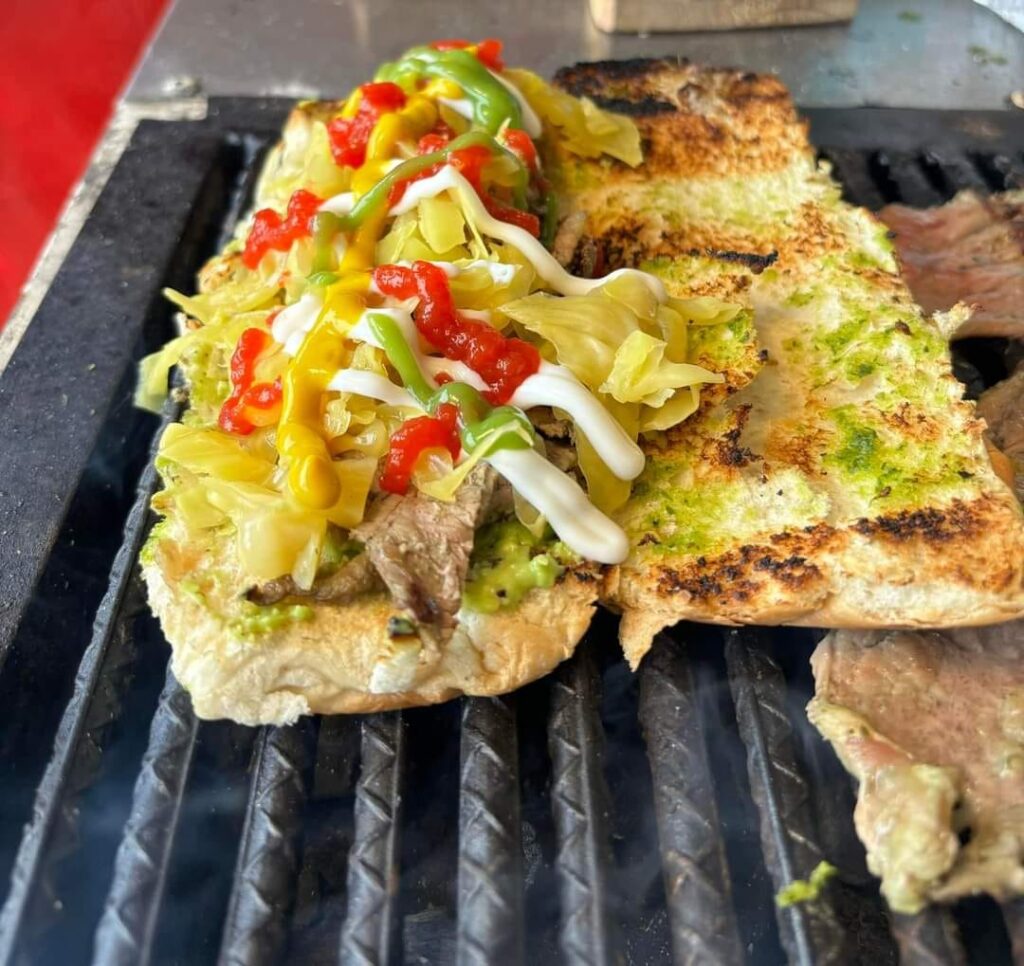 Ingredientes frescos: pan tostadito, guacamole, repollo embutido, salsa dulce, mayonesa, mostaza, picante, cebolla, chimichurri, Carne.